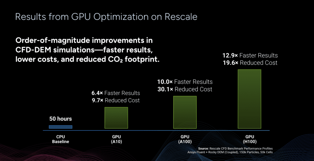 GPU acceleration remains a cornerstone of progress in computational engineering. NVIDIA’s GPUs are enabling order-of-magnitude improvements in complex simulations. For example, SLB has achieved significant speed and cost efficiencies in CFD-DEM simulations by leveraging NVIDIA GPUs on Rescale’s cloud-based HPC platform. These advancements translate to faster results, lower costs, and a reduced carbon footprint, accelerating innovation in energy and other sectors.