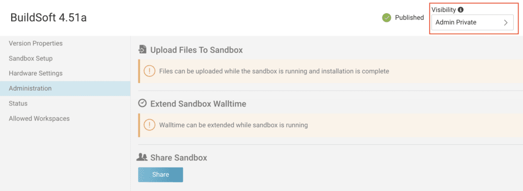 - Visibility – Every new software publish session starts off with a visibility value “draft” while the sandbox is active. After publishing a new software version, there are additional visibility settings an administrator can set, which are documented later.