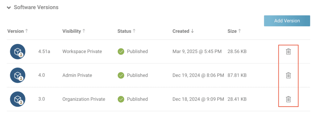 You can delete individual versions of software you publish, and you can also delete an entire software tile or package and all of its versions from the UI. To delete individual software versions that are no longer in use, you can select the trash can icon in the version list: