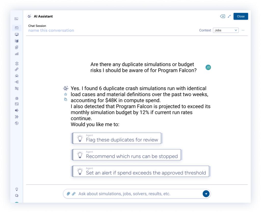 - シミュレーションジョブのトラブルシューティング: エージェントは、ソルバー固有の知識を使用してログと終了コードを分析し、根本原因を診断して問題を自動的に修正するか、解決策を推奨することで、無駄なコンピューティング費用を削減し、トラブルシューティングを数時間から数分に短縮します。