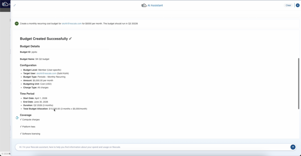 - How is it used? Organization and workspace admins can ask the Rescale Assistant to track consumption trends, monitor expiration dates, and verify remaining balances. The Budget Agent lets you create or modify budget configurations by describing your requirements in natural language.