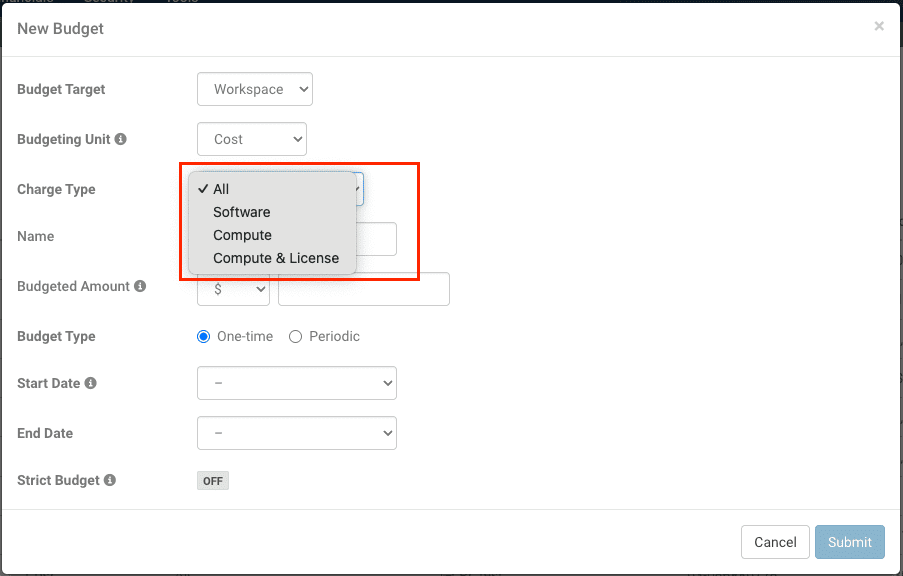 Rescale’s Cost Budgets feature now includes the ability to specify which types of charges to track. This enhancement allows users to create charge-specific budgets to monitor how different types of resources are being consumed on the platform, including Rescale platform usage, computing consumption, and software licensing-related charges.