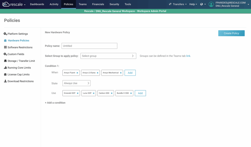 Hardware Policies give Rescale admins a centralized way to set hardware constraints per software for selected user groups, ensuring users see only compliant hardware options when configuring jobs. This helps enforce recommended hardware, streamline governance, and improve cost control.